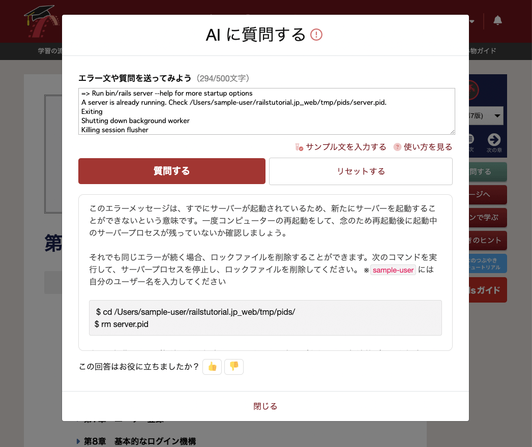 - 本機能は開発中のものであり、AI による出力結果が常に必ず正しい訳ではない点にご注意ください。例えば「A server is already running. Check /Users/sample-user/rails-tutorial/tmp/pids/server.pid.」というエラー文を入力すると以下のような回答を返す場合がありますが、「server.pid」のファイル削除ではなく、該当プロセスにシグナルを送って終了させるという方法もあります。